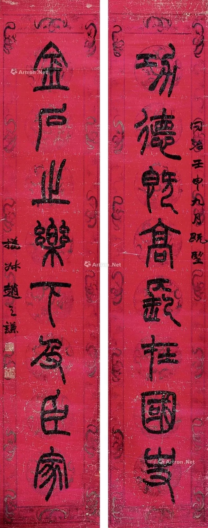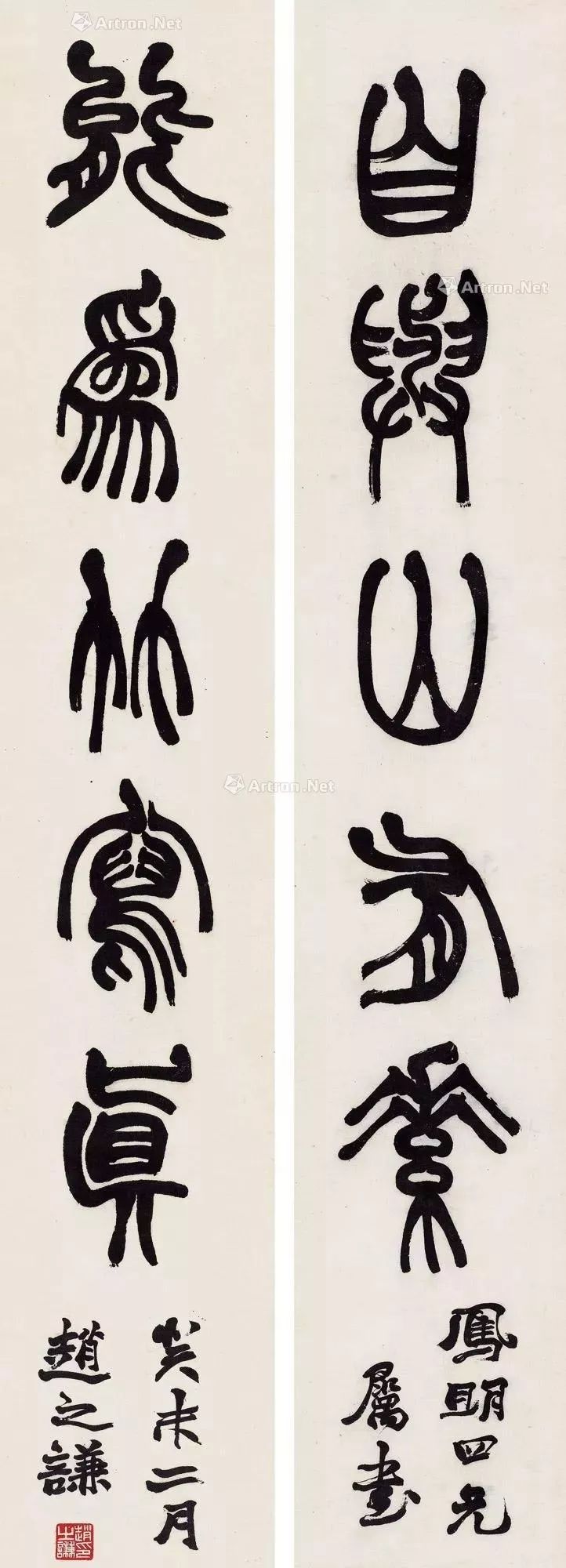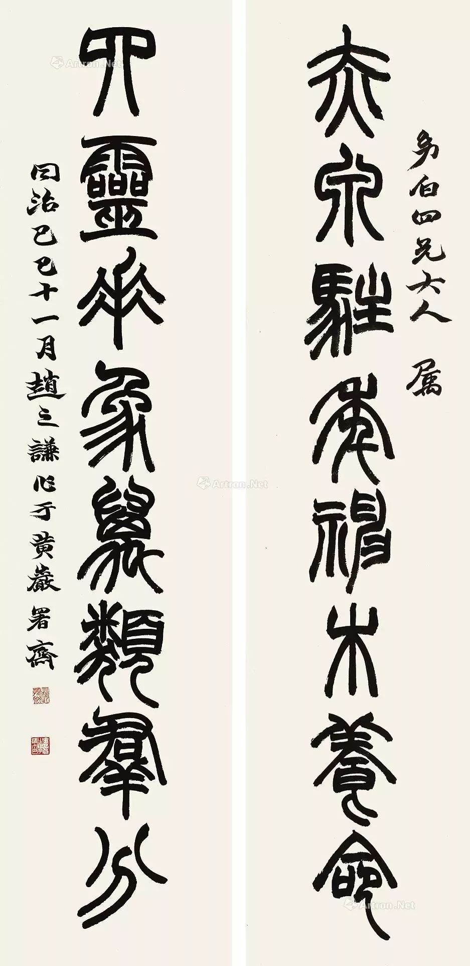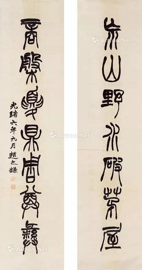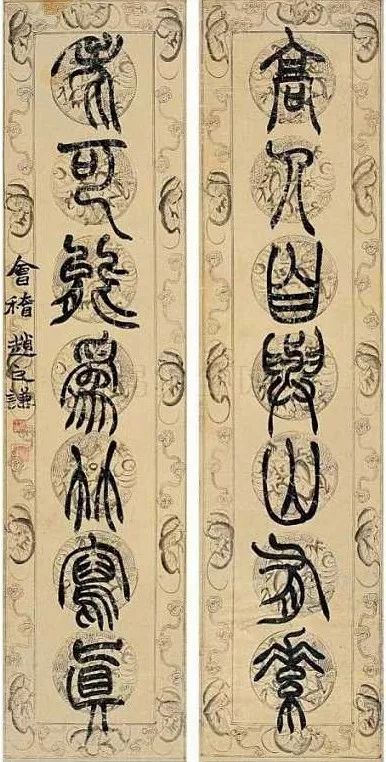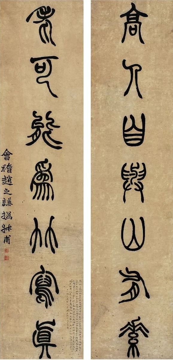赵之谦《篆书龚仪部诗七言联》纸本篆书 138.4×25.3cm×2 同治九年(1870)高野侯氏旧藏