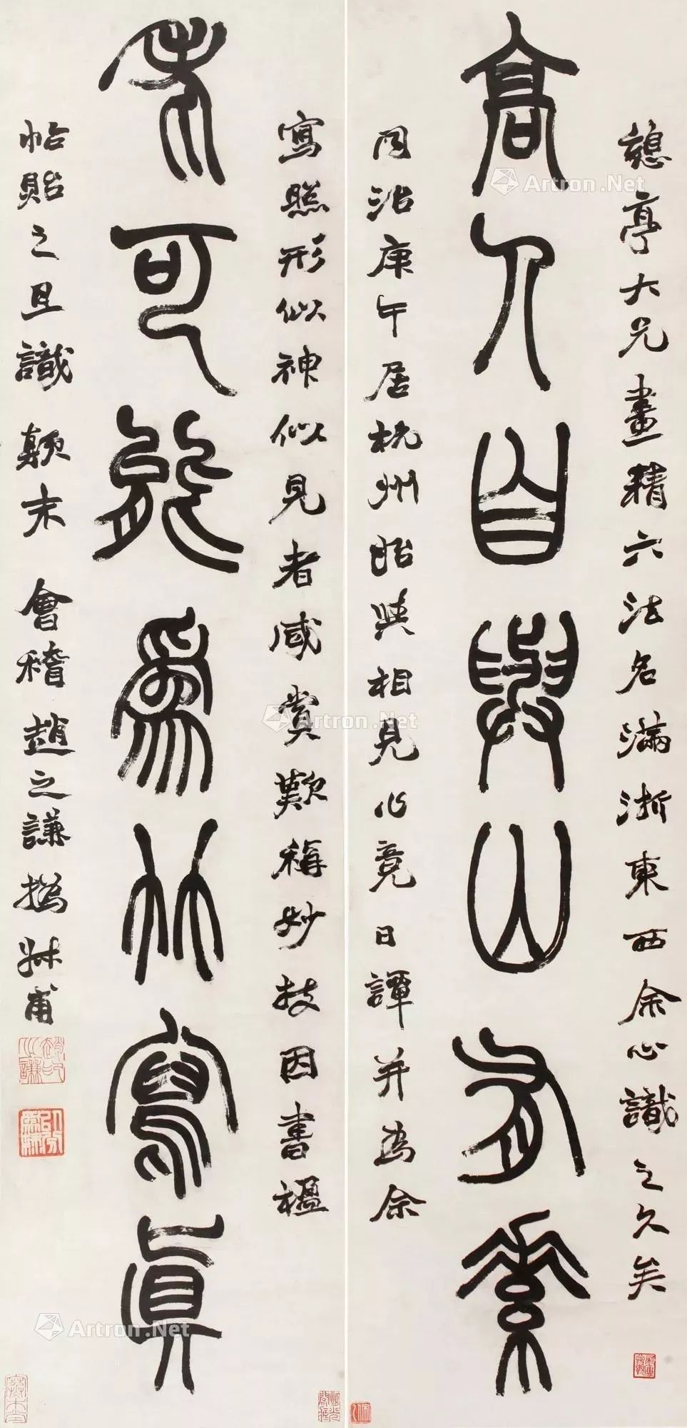 款识:憩亭大兄,画精六法,名满浙东西,余心识之久矣。同治庚午居杭州,始与相见,作竟日谭,并为余写照,行似神似,见者咸赏叹称妙技。因书楹帖贻之且识颠末。会稽赵之谦撝叔甫。