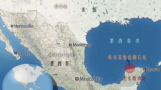 6500万年前,来自地外的一颗直径10公里的小行星撞上地球,导致当时地球上的生物大灭绝灭,撞击坑的平均直径大约180公里,撞击坑位于今天的墨西哥尤卡坦半岛,爆炸所释放的能量高达100万亿吨TNT,相当于目前全球核武器总当量的1.3万倍。