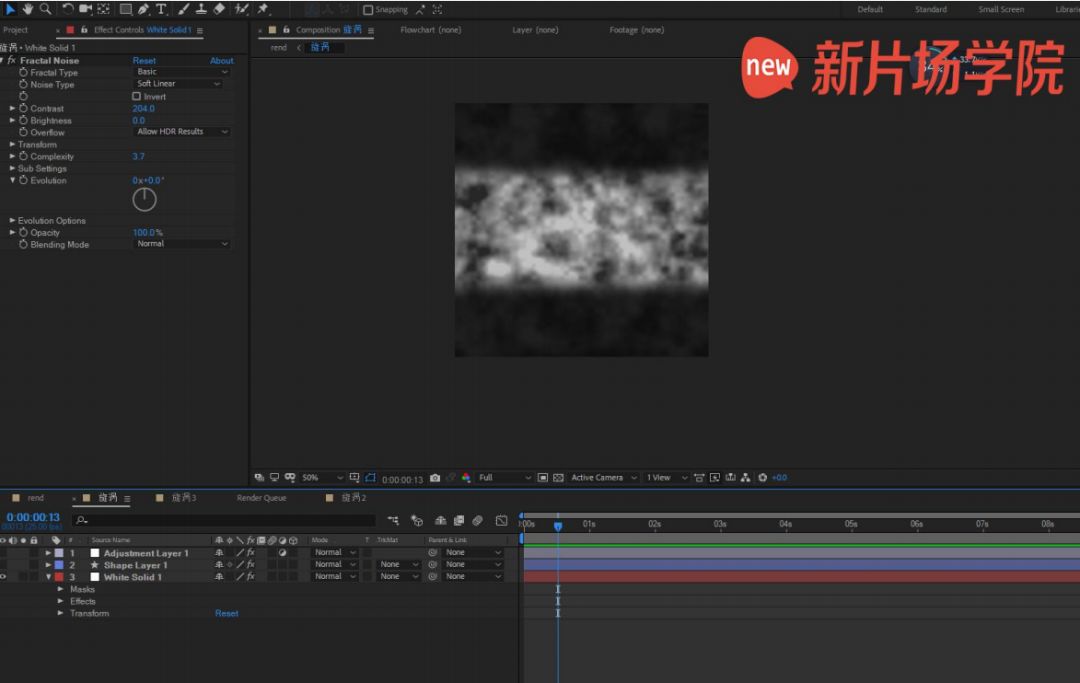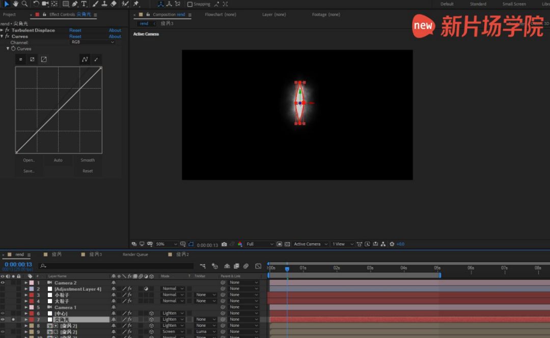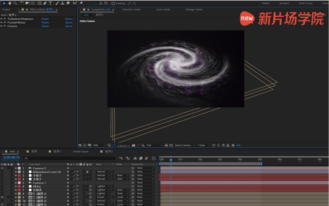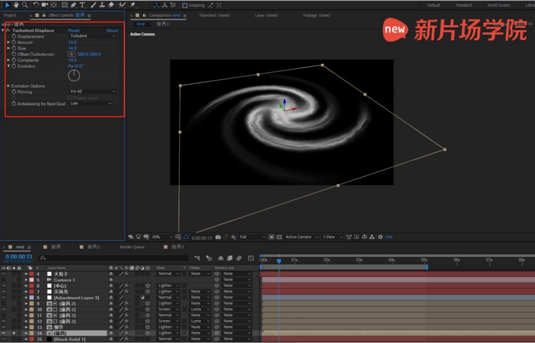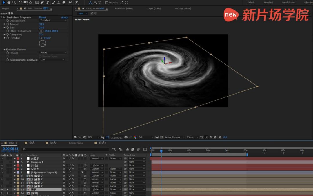 第七步 ,打开合成,开启三维层,并添加turbulent displace,这样可以防止边缘过于生硬。