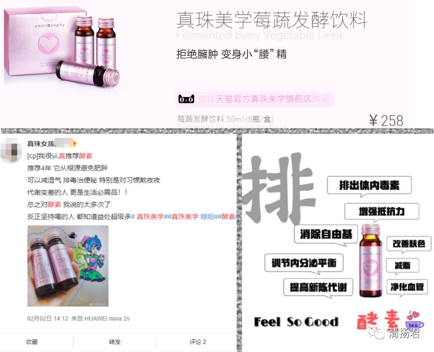 对于网友提到的真珠美学酵素饮品,清扬君也查询了一番,发现这款声称“能减肥”的真珠美学实际上只是普通食品类产品,并非保健品,更无“瘦身”、“排毒”、“治便秘”、“增强抵抗力”、“调节内分泌失调”、“净化血管”等功效。