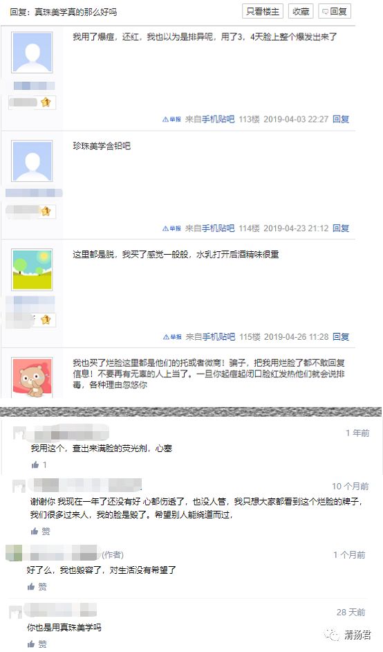 清扬君发现,正如爆料网友称其使用真珠美学的产品感觉不适,在网络上有众多网友质疑真珠美学的产品质量。有人声称使用真珠美学产品后“脸上爆痘、发红”,有人怀疑真珠美学化妆品含铅,甚至还有多人声称使用后出现“烂脸”现象,有使用者脸都烂了一年还没恢复。