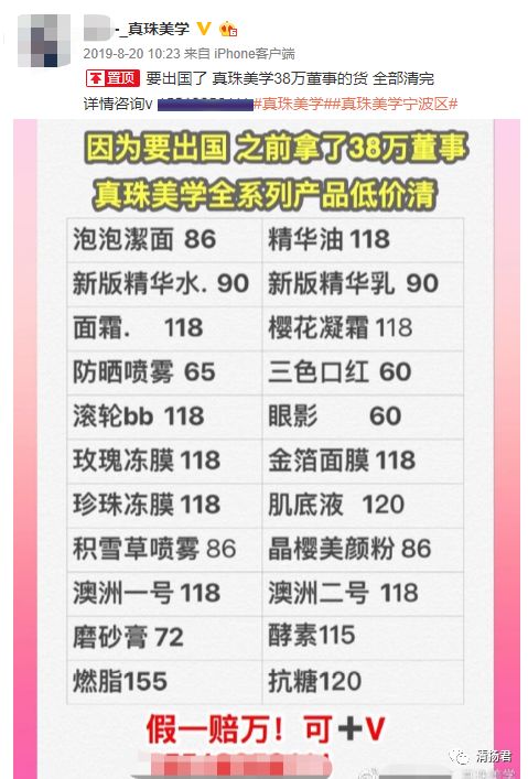 似乎为了印证陈女士所讲内容,清扬君发现:在微博上,有一位真珠美学38万董事(最高级代理商)长期置顶的微博。微博内容就是低价清货,比如零售价208元的精华水、精华乳,VIP级别会员拿货需要168元,该代理商直接以总经理级别的拿货价90元就清货了。