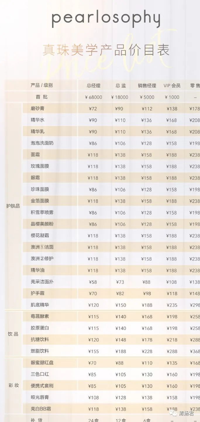 据了解,真珠美学微商从低到高有五层代理,分别是VIP会员(1000元)、销售经理(5000元)、总监(18000元)、总经理(即总代68000)、最高级别的董事(388000元)。