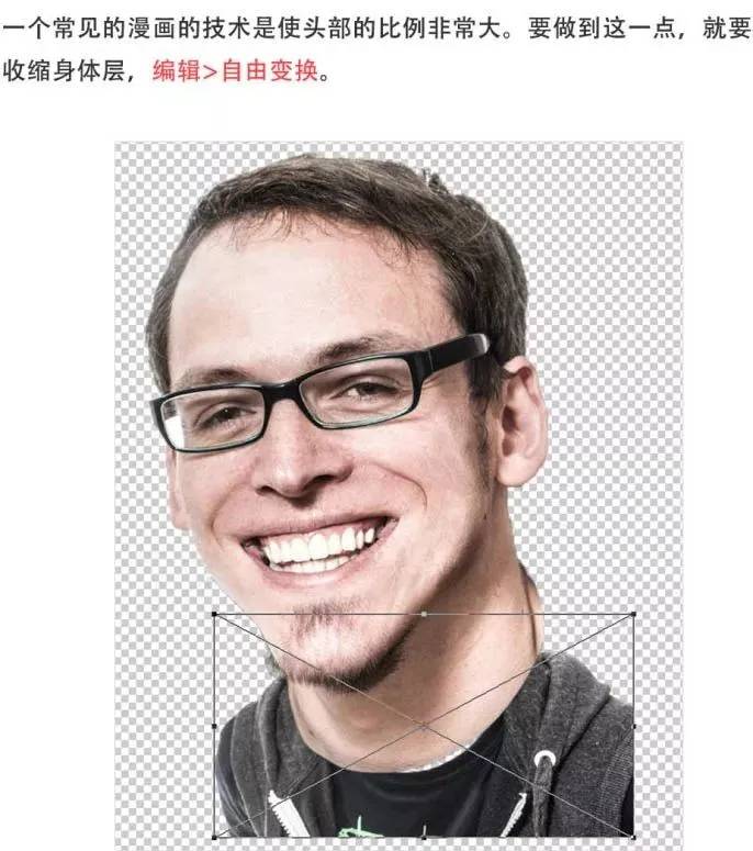 4、一个常见的漫画的技术是使头部的比例非常大。要做到这一点,就要收缩身体层,编辑 > 自由变换。
