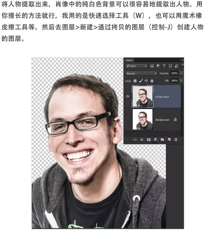 1、将人物提取出来,肖像中的纯白色背景可以很容易地提取出人物。用你擅长的方法就行,我用的是快速选择工具,也可以用魔术橡皮擦工具等。然后去图层 > 新建 > 通过拷贝的图层,创建人物