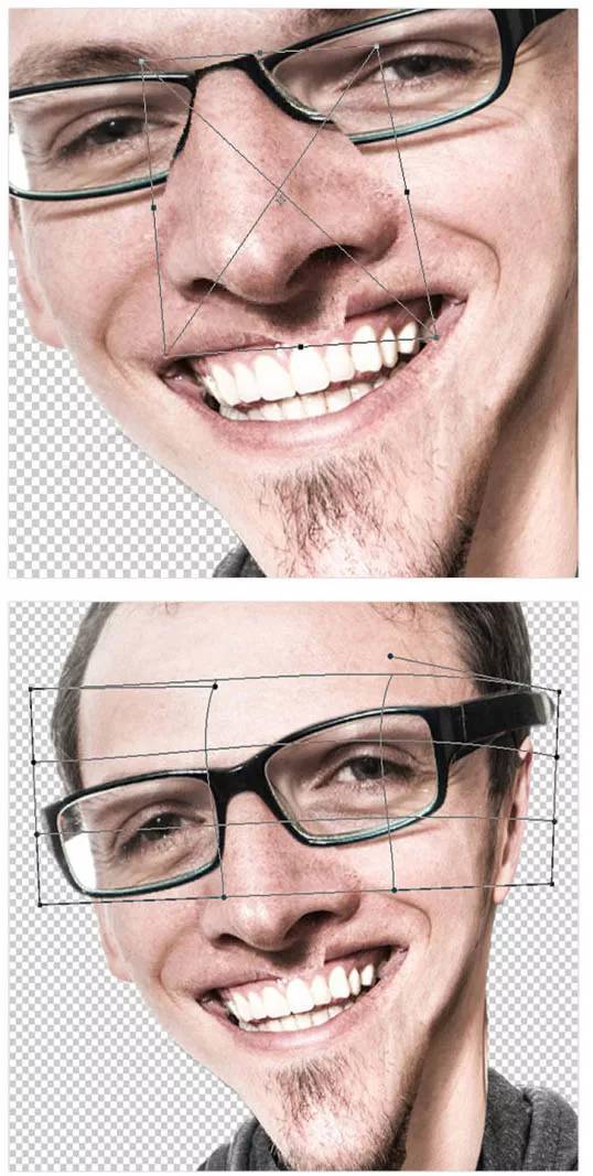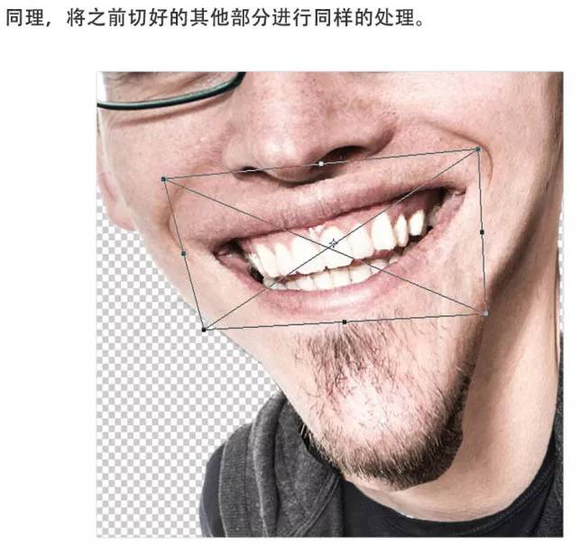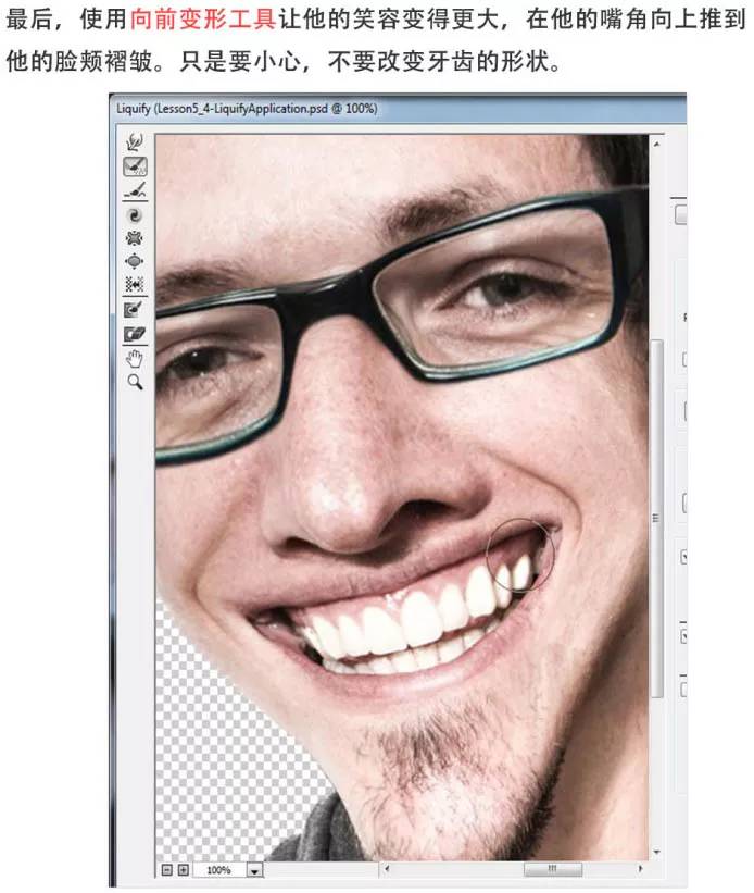 16、最后使用向前变形工具让他的笑容变得更大,在他的嘴角向上推到他的脸颊褶皱。只是要小心,不要改变牙齿的形状。
