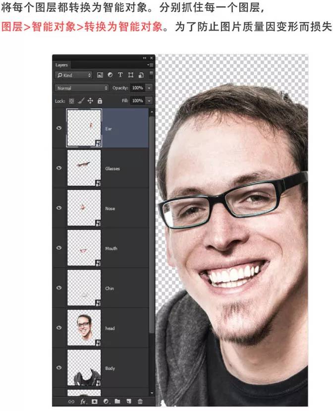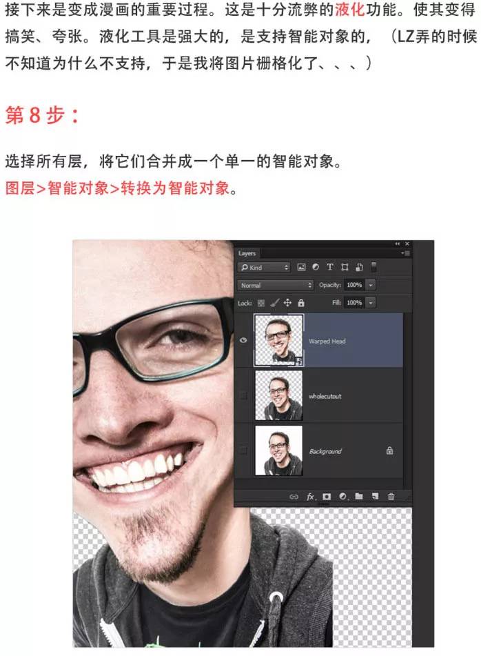 9、接下来是变成漫画的重要过程,液化功能。使其变得搞笑、夸张。液化工具是强大的,是支持智能对象的。选择所有层,将它们合并成一个单一的智能对象。图层 > 智能对象 > 转换为智能对象。