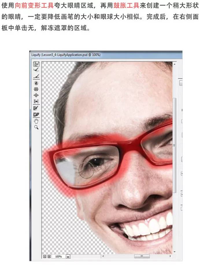 14、使用向前变形工具夸大眼镜区域,再用膨胀工具来创建一个稍大形状的眼镜,一定要降低画笔的大小和眼球大小相似。完成后,在右侧面板中单击无,解冻遮罩的区域。