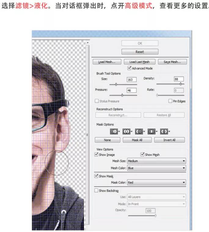 10、选择滤镜 > 液化。当对话框弹出时,点开高级模式,查看更多的设置。