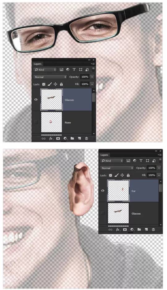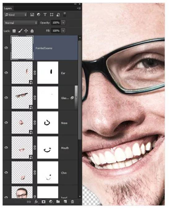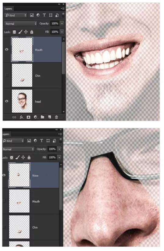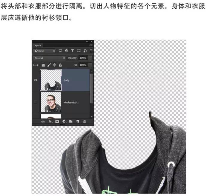 2、将头部和衣服部分进行隔离。切出人物特征的各个元素。身体和衣服层应遵循他的衬衫领口。