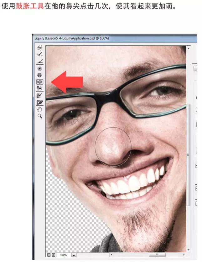 12、使用膨胀工具在他的鼻尖点击几次,使其看起来更加萌。