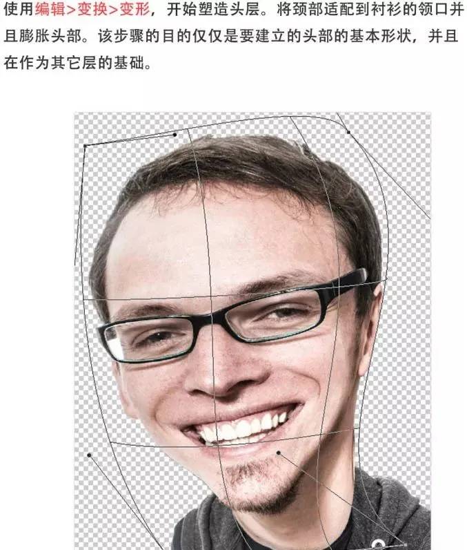 5、使用编辑 > 变换 > 变形,开始塑造头层。将颈部适配到衬衫的领口并且膨胀头部。该步的目的仅仅是要建立的头部的基本形状,并且在作为其它层的基础。