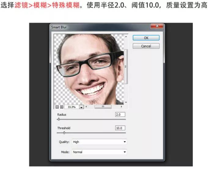 19、选择滤镜 > 模糊 > 特殊模糊。使用半径2,阈值10,质量设置为高。