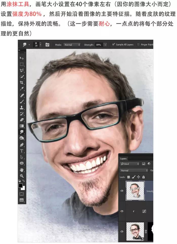20、用涂抹工具,画笔大小设置在40个像素左右,设置强度为80%,然后开始沿着图像的主要特征描。随着皮肤的纹理描绘,保持外观的流畅。