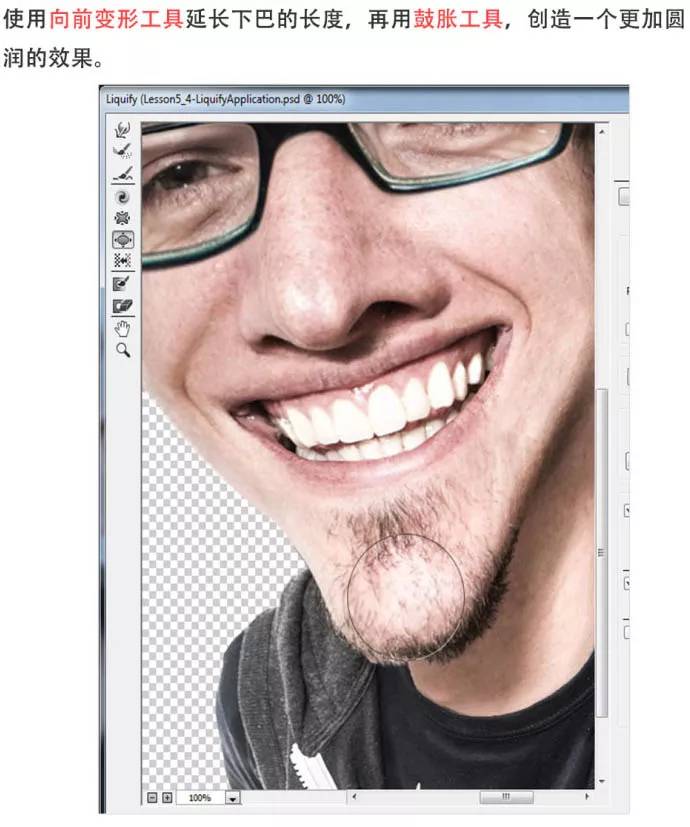 15、使用向前变形工具延长下巴的长度,再用膨胀工具创造一个更加圆润的效果。