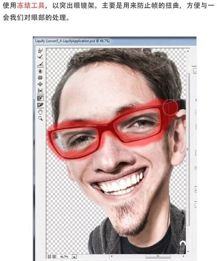 13、使用攻讦冻结工具,以提出突出眼镜框。主要是用来防止帧的扭曲,方便与一会我们对眼部的处理。
