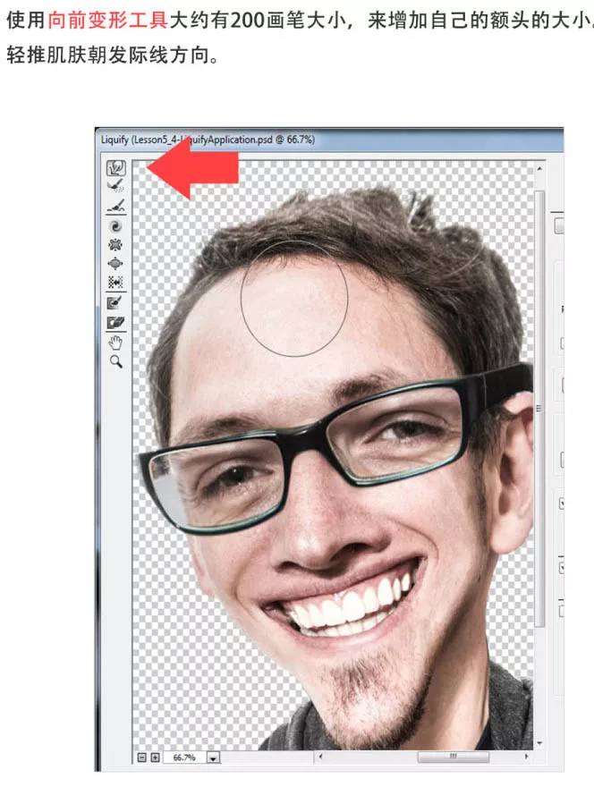 11、使用向前变形工具,大约有200画笔大小,来增加自己的额头的大小,轻推肌肤朝发际线方向。