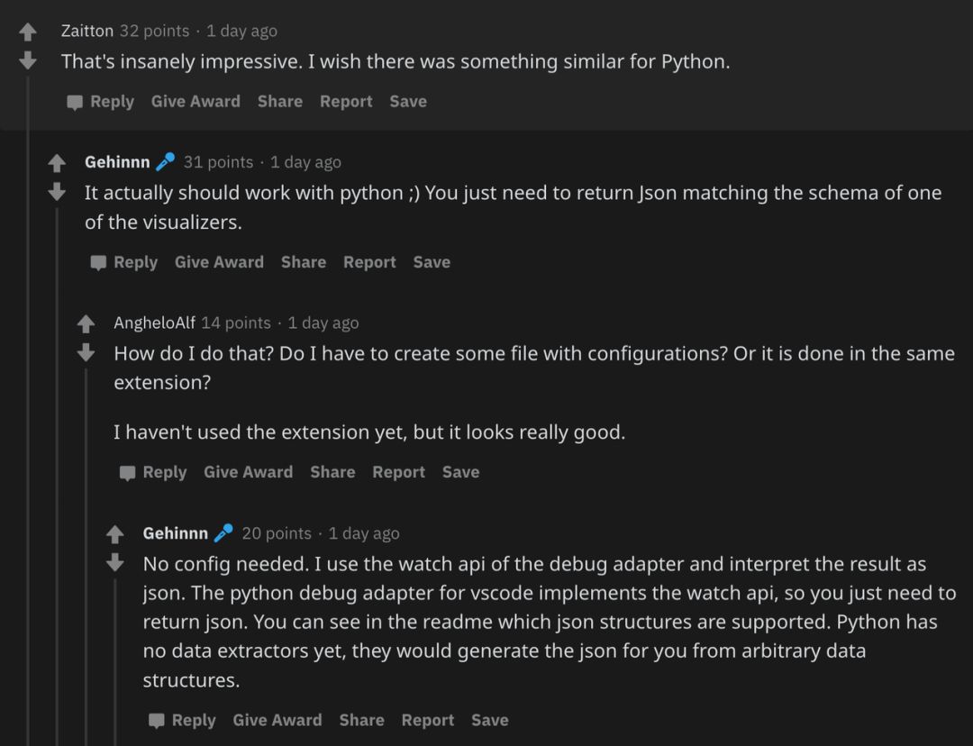 在 Reddit 社区上,也有很多开发者在讨论 Python 是不是能用,有没有更便捷的方式自动可视化 DeBug,而不是在 DeBug 前还需要手动先配置一番。