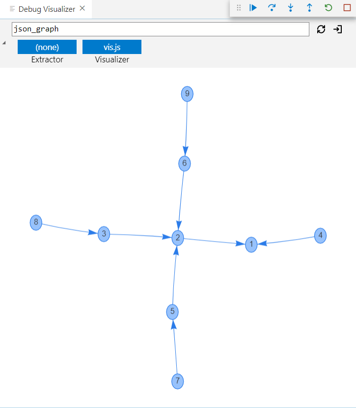 安装此扩展程序后,使用命令< Open a new Debug Visualizer View >打开新的可视化视图。在此视图里,设置断点逐步执行后,表达式的执行与动态可视化都会展示在里面。右上角的刷新键可将当前的可视化工具视图弹出到新的浏览器窗口,同时还可以通过展开详细信息的窗口去选择数据提取器以及可视化调试器。