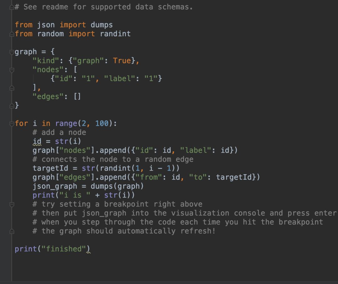 那么如果要手动调用 Debug Visualizer,开发者在 Demo 中新提交了一个 Python 示例。我们需要以 JSON 格式来表示数据,并完成自定义可视化,注意该 JSON 需要满足 Debug Visualizer 的格式定义。