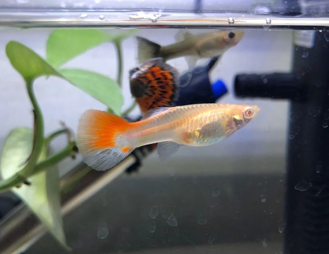 首先,从繁殖器官可以看到两者之间的区别。孔雀鱼肛门后面鱼鳍,鳍有尖头跟圆头。尖头的是公鱼,圆头的是母鱼。