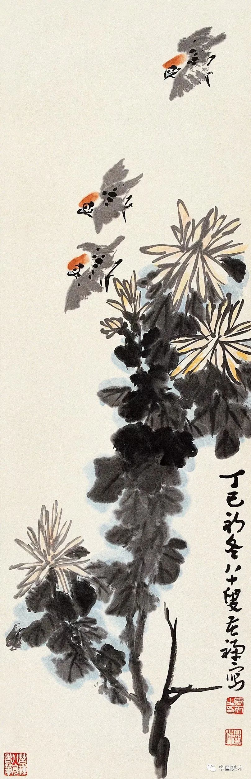 这已经达到中国大写意书画“技术”上的最高境界了!吴昌硕、齐白石都达到了这样的境界,他们画中的每一笔,都能放在他们自己的书法作品中毫不突兀,看他们的画,和看他们的书法是一样的。百年以来,中国画坛能达到这个高度的,寥寥数人而已。