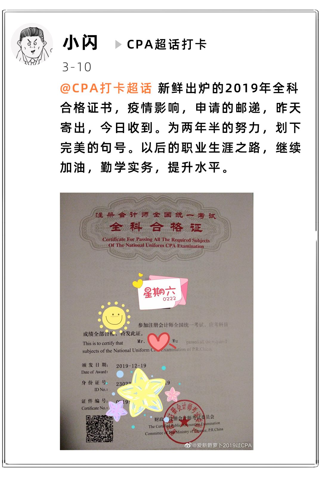 随着疫情的逐步控制,生活工作都逐渐开始恢复正常,而原本早应该下发的2019年CPA全科证合格证书在宣布延期后也开始逐渐正常下发。近期就有不少2019年通过了CPA六科的考生晒出了新鲜出炉的全科证书。