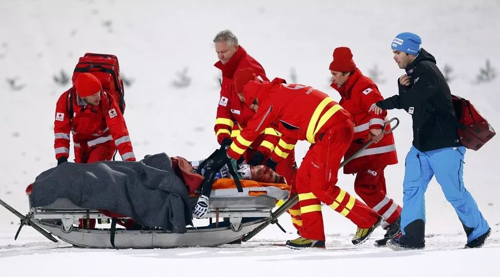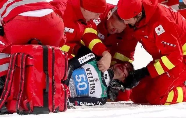 2015年,瑞士跳台滑雪运动员、前奥运冠军西蒙·阿曼在四山巡回赛奥地利站的比赛中落地时失去平衡,重摔倒地,当场血流满面。