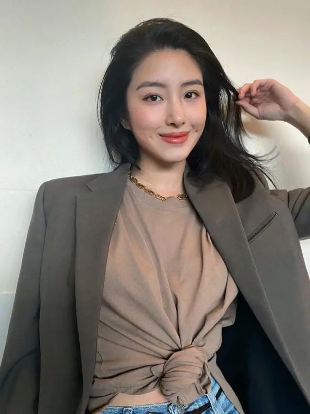 杨采钰的衣品就很不错,身穿一件灰色西装搭配一条蓝色牛仔裤,本身西装是很正式的服饰,但在搭配牛蓝色牛仔裤之后,呈现出很休闲的气息,并且杨采钰还选择了一件驼色的T恤作为内搭,重点是她把T恤的衣摆很自然的系了起来,这样就有个好处就是很轻松的就能穿出了腰线,呈现出上短下长的身材比例。
