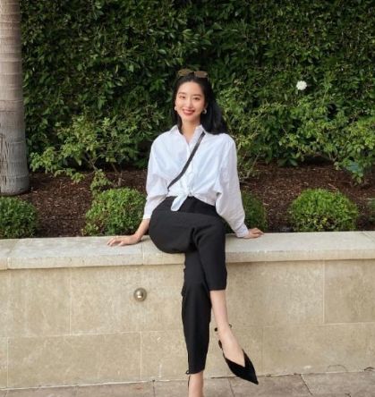 杨采钰这身OL复古风的穿搭,上衣是宽松纯白色衬衣,腰间松松的系着一个蝴蝶结,巧妙的展现了杨采钰婀娜的身姿;搭配黑色紧身西装裤,慵懒的翘着二郎腿,肩上背着黑色细带手提包,职场女主气质已经呼之欲出了!