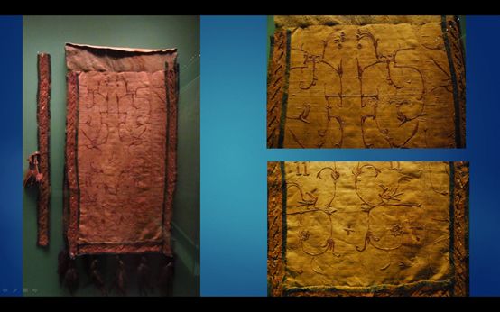 巴泽雷克文化另外一个特点是马鞍,这应该是世界上比较早发现马鞍的地方。这里的马鞍做的特别漂亮,其中有一对,用骨雕做鞍桥、皮囊里面塞鹿毛,再连起来捆在马背上面,人坐上去就相对舒服,马也很舒适。