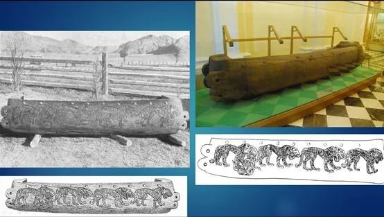 这里最著名,发掘时代较早且分布很多,有小墓有大墓,特别密集,结构也差不多。它的独木棺级别比较高,上面雕刻了老虎和羊的形象,目前存放在埃米塔什博物馆里。巴泽雷克人喜欢的动物很多,除了最喜欢的格里芬,也喜欢老虎。