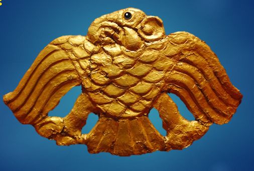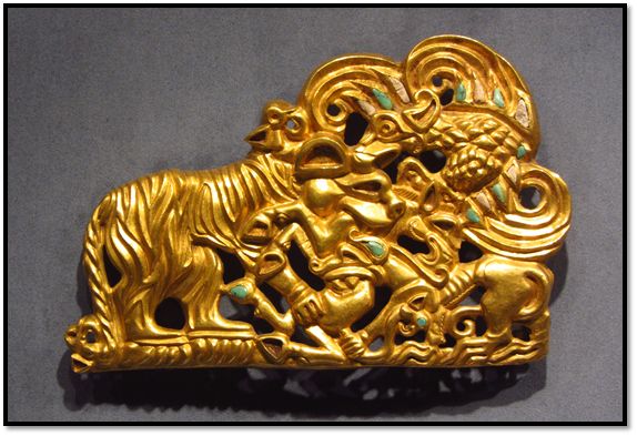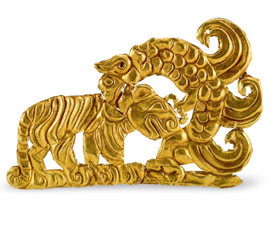 在巴泽雷克墓地西部旁边的西伯利亚,可能存在富有的一群人,他们用黄金做了许多动物风格的饰牌,也吸收了格里芬的形象,有点像龙或老鹰,耳朵像格里芬的耳朵,鹿角结尾的地方又像格里芬的头,常常是跟老虎搏斗的形象。这批金器中有好几件,当年由一个西伯利亚农场主献给彼得大帝,彼得大帝下令收藏起来,称为“彼得大帝宝藏”,如今收藏在埃米塔什博物馆的特别展厅。