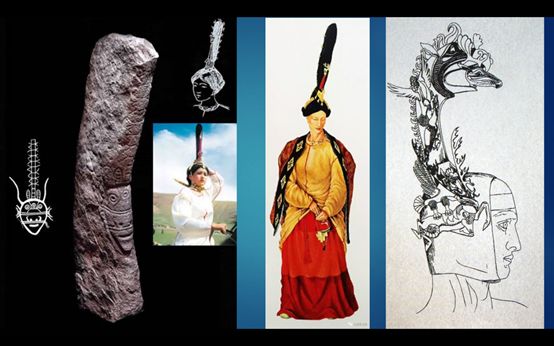 他们喜欢把帽子弄的特别高,尤其是女性,如此一来,帽子上就可以装饰得更美。游牧民族喜欢戴这种尖帽,除了显得形象高大之外,还因为高速骑马时,尖帽子不兜风,不用担心帽子被吹飞。另外草原白天很晒,高帽子里面的空气可以隔热,冬天也能更好地保暖。从考古发现看,小亚细亚的赫梯人就非常喜爱尖帽,南西伯利亚2500年前的奥库涅夫文化也有这种对高帽的喜爱,头上像长了天线,希望以此通天。