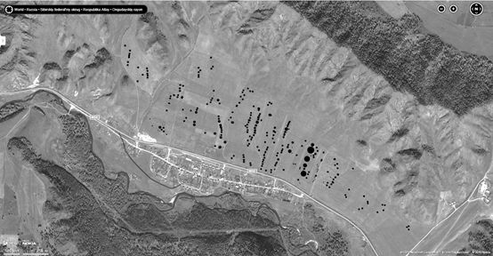 巴泽雷克文化主体分布就在阿尔泰山这一片,图埃克塔这个地方正好处于阿尔泰山正中间的腹心地带,墓葬很密集,至少有三座以上的首领级墓葬,墓葬直径七十米以上,最大的达到了一百米左右,墓葬结构有一致性,也是木椁木棺。游牧人选择住所和墓地,附近肯定有他崇拜的神山或者圣水,或者可以夜观星宿运动,比如图埃克塔链状分布的大墓正好对着河对岸的一座大山。