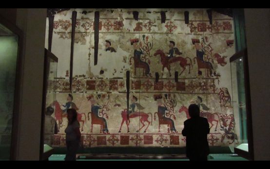 中国的两块丝绸出土于巴泽雷克3号墓和5号墓。3号墓出土的一小块锦,碳14测大约是公元前299年左右。另外一块5号墓的,稍微晚一点,它用一整块丝绸做成一块马垫,上面绣凤鸟纹,非常奢侈,这些应该都是从中国南方,比如楚国间接传过去的。