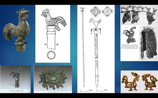 到了巴泽雷克,格里芬的头上有些长着鸡冠,在帽子上、陶器上出现了完整的公鸡形象,这有可能是从中国西南慢慢传过去的,希腊后来也有了公鸡形象。鸡在波斯文化中具有崇高的地位,这都有可能是从中国西南传播出去的。另外如山字纹铜镜、殉葬车等都受到了中国的影响。