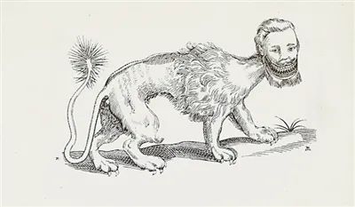 阿什顿写道:“它像狮子一样大而粗糙,有相似的脚,但它的耳朵和脸就像一个人的耳朵和脸;它的眼睛是灰色的,身体是红色的,有一条像陆地蝎子一样的尾巴,上面有刺而不是毛发。狮身蝎尾兽发出的声音类似于管乐和喇叭的和声。它的速度不亚于野鹿,它非常狂野,能吞噬人类。”