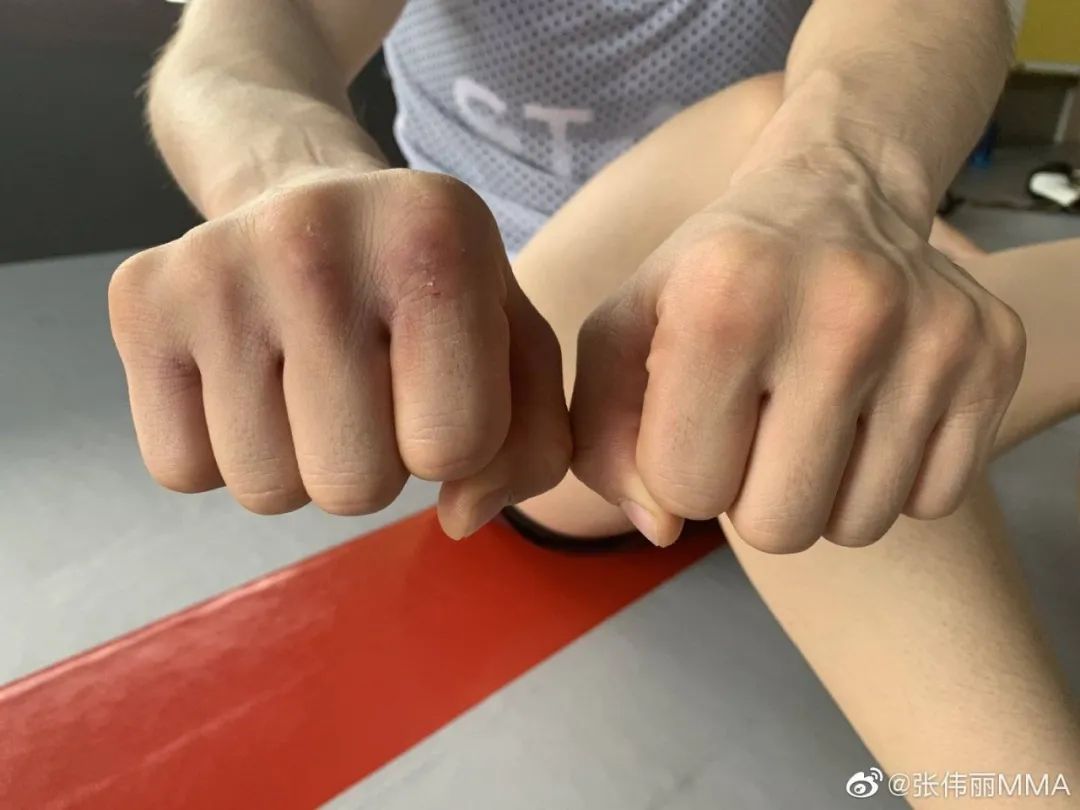 鼻青脸肿、流血破皮是家常便饭。备战UFC的两年里,张伟丽打烂了4副拳套,手指每一个关节都有厚厚的茧,经常“练着练着就哭了”。