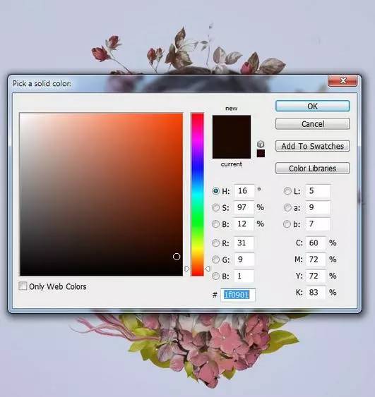 1、我们已经完成了加入的元素,现在是时候改变颜色。创建一个颜色填充在层的顶层和挑颜色 #1f0901。设置此图层模式为排除100%。