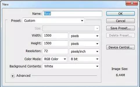 1、创建一个新的1500 * 1500像素在photoshop中使用以下设置文档:(因为我们图片像素低1000*1000就够了)