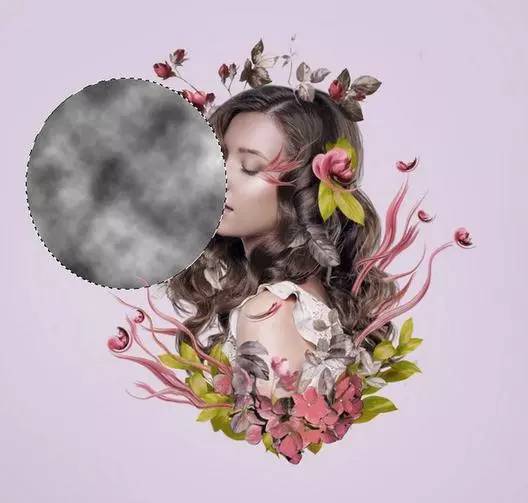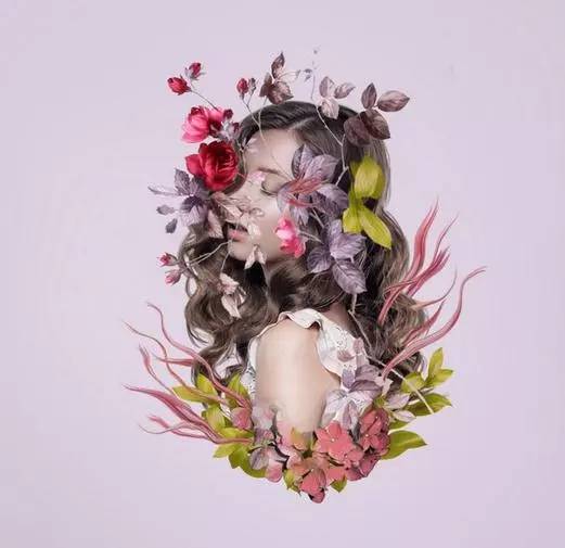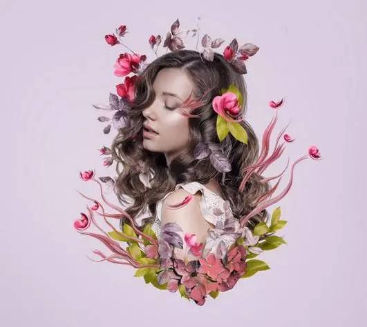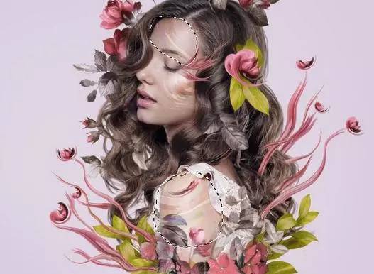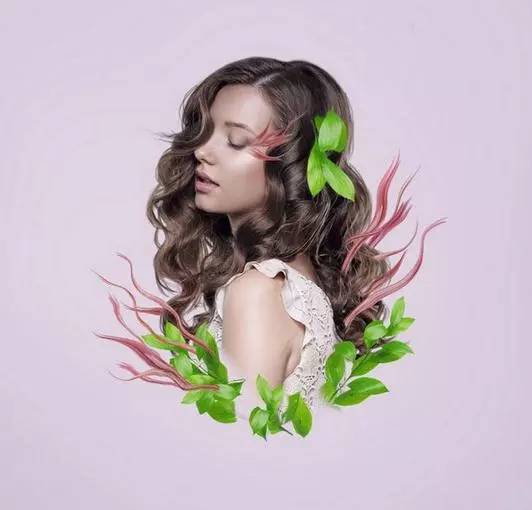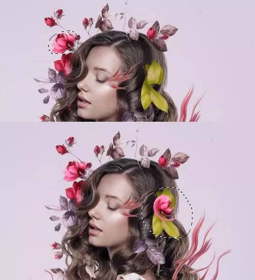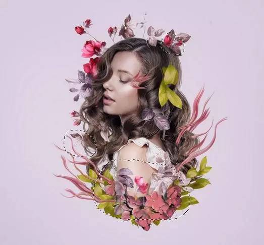 9、使用套索工具(l)选择在模型顶部的花,并按下控制-j复制一个新的图层这种花。选择 液化工具,并挑选旋转扭曲工具顺时针方向弯曲和调整这种花,使它看起来像一个抽象的。随意将其形成你想要的方式,但保持它仍然在寻找像花一样,所以不要调整太多。放于有叶的头部区域的左侧。【这一步用液化多试几次,个人经验液化第一笔没做好最好重来,多试几下】。