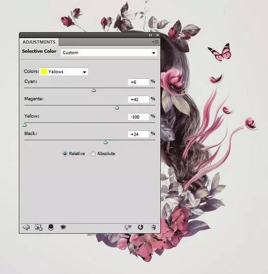 6、使用可选颜色调整层,以改变叶片和蝴蝶1的颜色。