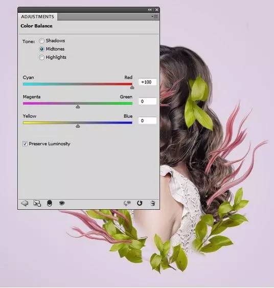 10、作出这些分支一组,并添加色彩平衡调整图层。增加了红色的值中间调。