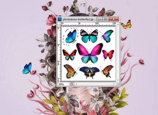 1、打开蝴蝶1图像和背景隔离蝴蝶。选择中间蝴蝶并把它上面的右侧最高抽象花。