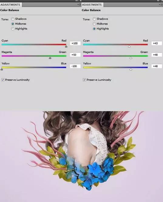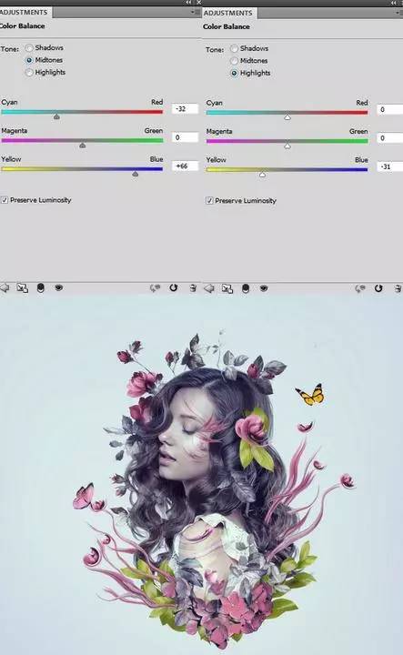 2、做一个色彩平衡调整图层,改变中间色调和高光值。