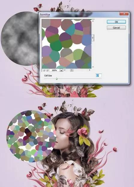 2、按下控制-d取消选择这个圈子,并转到滤镜>像素化>点状。设置单元格大小为67。