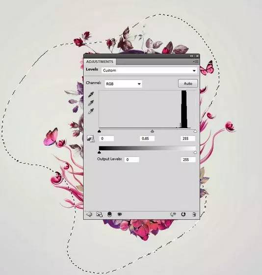 8、做一个色阶调整层,减少中间调值。选择此图层蒙版和油漆在中间,使边缘有点暗。它有助于创造一个微妙的晕影效果。