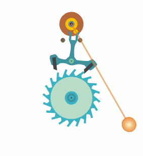 摆钟工作主要应用了单摆的等时性,还有就是巧妙的应用了齿轮与擒纵器的组合,利用摆锤每次单摆所用时间一样,来控制擒纵器交叉收放齿轮,所以这也是我们所听到摆钟滴答滴答声音的原因。
